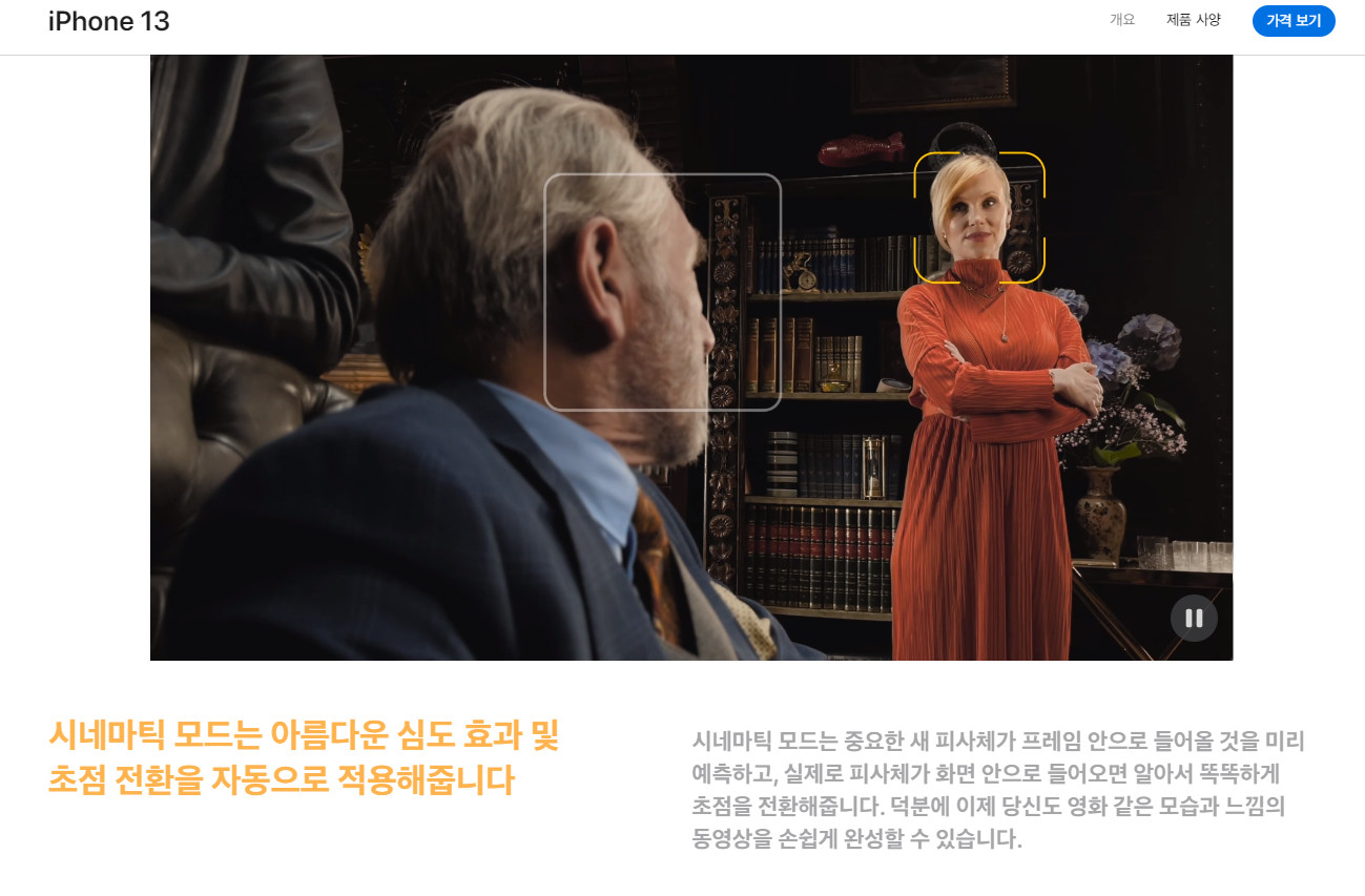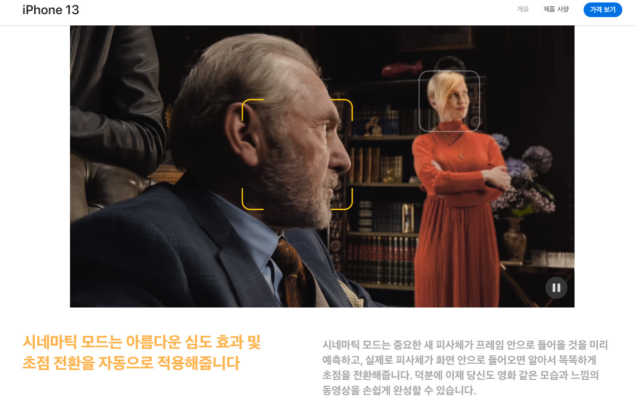 아이폰13에 탑재된 시네마틱 모드는 인공지능이 인물의 얼굴 방향을 잡아 자동으로 초점을 맞추거나 촬영이 끝난 뒤에도 후반 작업을 통해 영상의 초점을 다른 피사체로 옮길 수 있습니다.