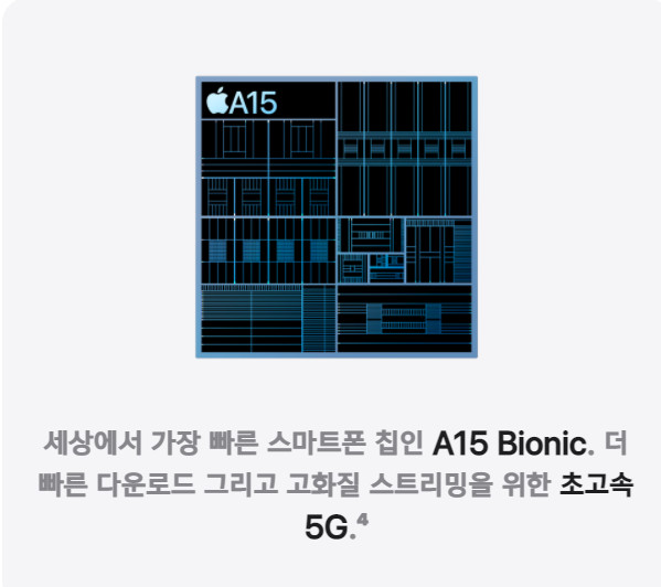 시장의 예측대로 더욱 향상된 5나노 A15 애플리케이션 프로세서(AP)를 아이폰13에 탑재했습니다.